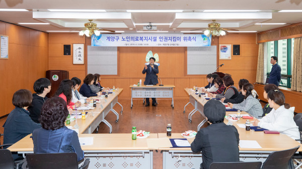 인천 계양구는 23일 노인의료복지시설 입소 노인들의 인권보호 및 학대예방을 위한 '노인의료복지시설 인권지킴이' 22명을 위촉했다. 사진은 위촉식에 참석한 박형우 구청장이 인사말을 하는 모습. (사진제공=계양구청)