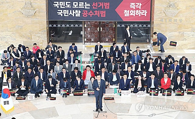 자유한국당 황교안 대표가 24일 오전 국회 로텐더홀에서 열린 비상의원총회에서 선거법·공수처법 철회를 촉구하는 규탄 발언을 하고 있다.