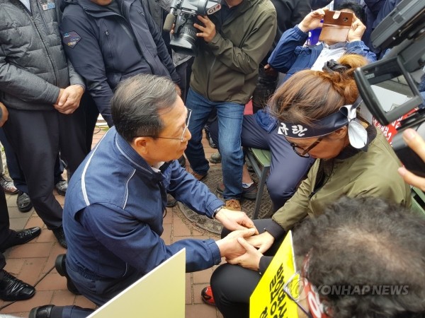 | ▲ 24일 고성군에 이어 속초시를 방문한 김종갑 한국전력공사 사장이 한전 속초지사에서 산불 사망자 유족에게 사과하고 있다./연합뉴스 | ||