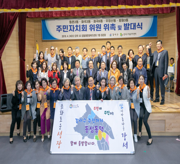 서울 강서구는 24일 곰달래문화복지센터에서 주민자치회 발대식을 개최했다. 이날 각 동 최연장자와 최연소자 대표 위원 2명에게 위촉장을 전달했다. 사진은 노현송 구청장(두번째줄 오른쪽 다섯번째)과 자치회 위원들이 파이팅을 외치는 모습. (사진제공=강서구청)