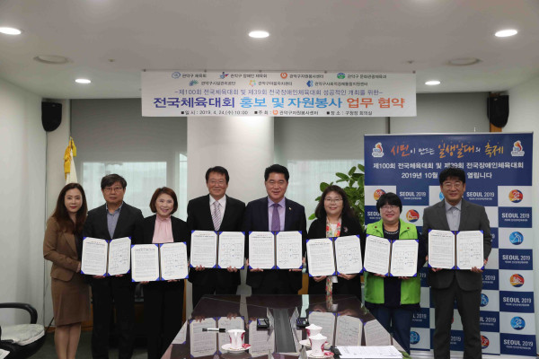 서울 관악구가 24일 전국 체육대회 및 전국 장애인체육대회의 성공적인 개최를 위해 지역내 유관기관과 '전국체육대회 홍보 및 자원봉사' 업무 협약을 체결했다. 사진은 박준희 구청장(왼쪽에서 네번째)과 관계자들의 기념촬영 모습. (사진제공=관악구청)