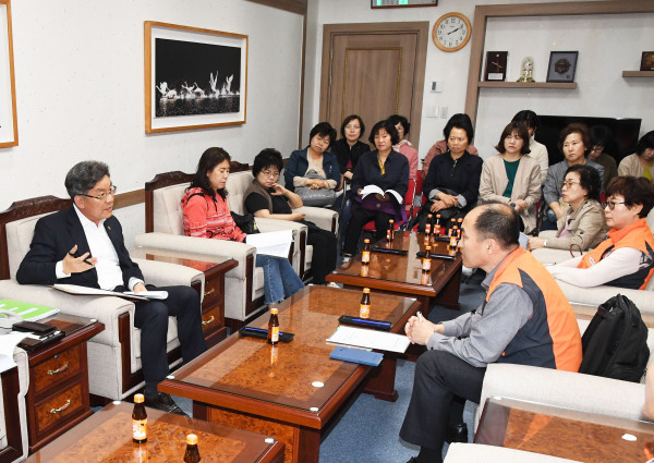 백운찬 울산시의원은 최근 의사당 4층 접견실에서 공공연대노동조합 울산지부 울산아이돌봄지회 간부 및 회원 20여명과 아이돌봄지원사업 활성화를 위한 간담회를 가졌다. 사진은 노조 간부들과 만난 백 의원이 '아이돌보미'와 관련해 학대예방 교육 등에 대해 논의를 하는 모습. (사진제공=울산시의회)