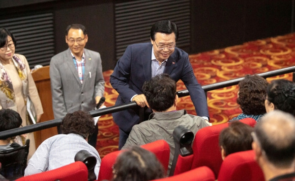서울 용산구가 지난 23일 롯데시네마 용산관에서 지역내 장애인 150명을 대상으로 '무료 영화 관람 행사'를 열었다. 이날 행사에서는 <나의 특별한 형제>라는 영화를 상영했다. 사진은 성장현 구청장이 행사에 참여한 장애인들에게 인사말을 전하는 모습. (사진제공=용산구청)