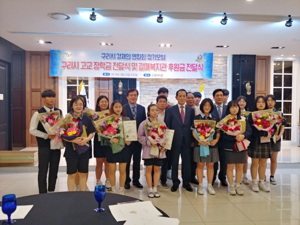 경기 구리시 경제인연합회는 24일 지역내 7개 고등학교 14명의 학생에게 각 50만원의 장학금(약 700만원)을 전달하는 한편 갈매사회복지관에 200여만원의 후원금을 전달했다. 사진은 장학금 전달 후 관계자들과 학생들의 기념촬영 모습. (사진제공=구리시청)