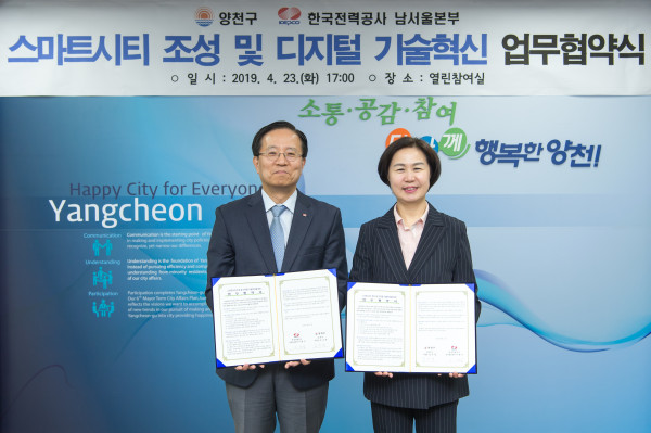 김수영 양천구청장(오른쪽)이 지난 23일 양천구청 열린참여실에서 개최된 ‘스마트시티 조성 및 디지털 기술혁신 업무 협약식’에 참석해 기념촬영을 하고 있다. 구는 사회적 약자 돌봄서비스 및 스마트시티 조성 등 사업에 필요한 전기 지원 및 도시데이터를 상호 공유하고자 한국전력공사 남서울본부와 이번 협약을 체결했다. (사진제공=양천구청)