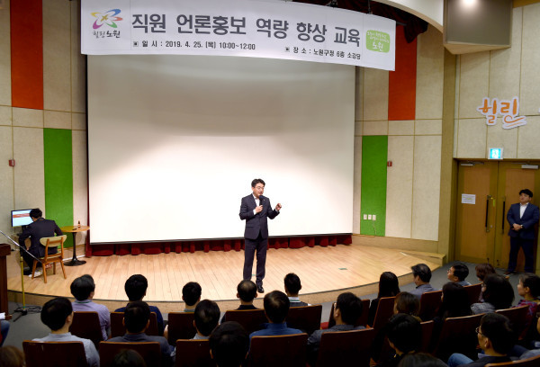서울 노원구는 최근 구청 6층 소강당에서 각 부서 언론담당자와 홍보에 관심있는 직원 200여명을 대상으로 ‘직원 언론홍보 역량 향상 교육’을 실시했다. 이날 기사작성법 등의 교육이 진행됐다. 사진은 오승록 구청장이 인사말을 전하는 모습. (사진제공=노원구청)