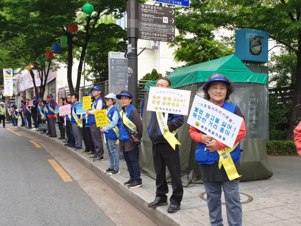 성동구는 최근 바르게살기운동 성동구협의회 주관으로 ‘미세먼지 줄이기 캠페인’을 실시했다. 이날 협의회 회원 100여명이 왕십리 오거리 일대에서 출근길 시민들을 대상으로 캠페인을 펼쳤다. 사진은 캠페인을 실시하고 있는 모습. (사진제공=성동구청)