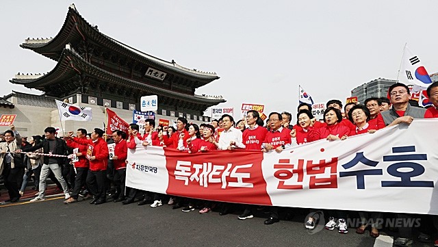 자유한국당 황교안 대표와 의원들이 27일 오후 서울 광화문광장에서 열린 ‘문재인 STOP(멈춤), 국민이 심판합니다!’에서 행진하고 있다.