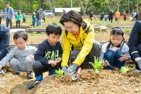 김수영 서울 양천구청장이 지난 27일 오후 2시 양천구 양천도시농업공원(신월동 산 174-1일대)에서 열린 ‘양천도시농업공원 개장행사’에 참석해 아이들과 함께 모종을 심고 있다. (사진제공=양천구청)