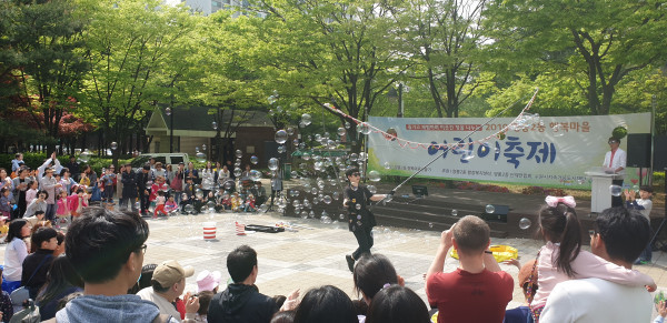 경기 수원시 영통구 영통2동 행복마을 만들기는 지난 27일 벽적골 공원에서 ‘2019 영통2동 행복마을 어린이 축제’를 성황리에 개최했다. 사진은 주민들이 버블쇼를 관람하고 있는 모습. (사진제공=수원시청)