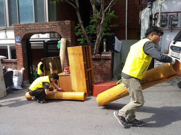 경기 구리시가 지역내 목양교회 자원봉사팀과 함께 29일 복지 사각지대 발굴 대상자 가운데 주거환경 취약상태에 처한 청·장년 1인 가구를 방문해 도배, 장판 교체 등의 주거환경 정비를 실시했다. 사진은 노후된 장판을 철거하는 봉사자들의 모습. (사진제공=구리시청)