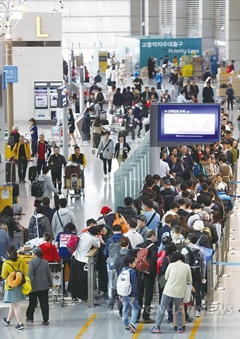 5월1일 근로자의 날(노동절)을 시작으로 어린이날(5일)과 대체공휴일(6일)까지 이어지는 징검다리 연휴를 앞둔 30일 오전 인천국제공항 1터미널 출국장이 북적이고 있다.