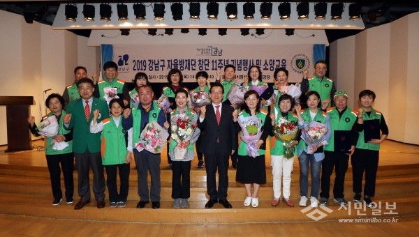 정순균 서울 강남구청장이 최근 강남구 대치평생학습관 대강당에서 열린 ‘2019 강남구 자율방재단 창단 11주년 기념행사’에 참석해 우수단원 20명에게 표창장을 수여한 후 함께 기념촬영을 하고 있다. (사진제공=강남구청)