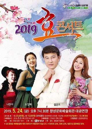 24일 금요일 오후 7시 30분에는 ‘2019 효 콘서트’가 준비되어 있다. 영화 서편제의 여주인공이자 소리꾼 ‘오정해’, 트로트계의 젠틀맨 ‘설운도’, 뱀이다, 서울․대전․부산․대구 찍고의 ‘김혜연’, 최고의 남자를 부른‘나현아’가 출연한다. 걸쭉한 소리와 화려한 트로트가 어우러진 이번 공연은 어버이의 은혜에 감사의 마음을 전하는 기회가 될 것이다. 9일 목요일 오전 9시부터 예매가 시작된다.