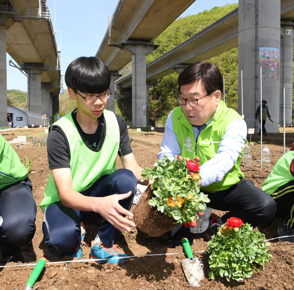 경기 광주시는 최근 남한산성면 하번천리에 위치한 공영 시민텃밭에서 신동헌 시장을 비롯해 임종성 국회의원, 박현철 시의회 의장, 기관 관계자, 텃밭 분양자, 자원봉사자 등 130여명이 참석한 가운데 '도담텃밭 개장식 및 꽃 심기 행사'를 열었다. 사진은 신 시장(오른쪽)이 참여자와 꽃을 심고 있는 모습. (사진제공=광주시청)