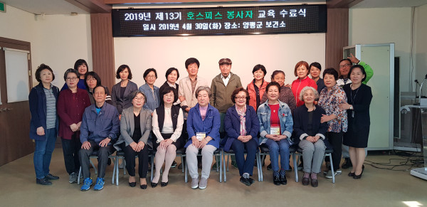 경기 양평군 보건소는 양평호스피스와 함께 지난 3월12일부터 매주 화요일 17명의 호스피스 자원봉사자를 양성하고, 30일 보건소 교육실에서 수료식을 진행했다. 사진은 이날 수료식 진행 후 자원봉사 수료자 및 관계자들의 기념촬영 모습. (사진제공=양평군청)