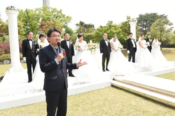오승록 서울 노원구청장은 30일 공릉동에 위치한 육군사관학교 잔디마당에서 열린 ‘사랑이 꽃피는 합동결혼식’에 참석해 신랑·신부에게 축하의 뜻을 전했다. 사진은 오승록 구청장이 이날 결혼하는 5쌍의 부부에게 축사를 전하는 모습. (사진제공=노원구청)
