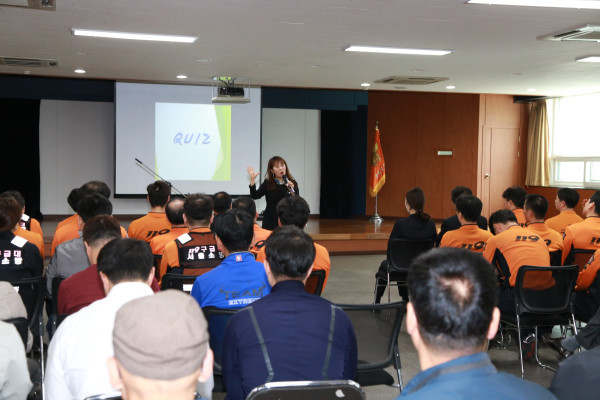 서울 영등포소방서는 30일 오전 소방서 4층 대강당에서 내근, 현장대응단, 안전센터 직원 등이 참석한 가운데 4월 정례조례(직장교육)를 실시했다. 이번 교육은 ▲소방공무원 자살예방 및 정신건강 증진교육 ▲상반기 4대폭력 예방 통합교육 등으로 진행됐다. 사진은 자살예방 및 정신건강 증진 강사로 초빙된 이경수씨가 강의하는 모습. (사진제공=영등포소방서)