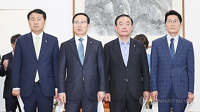 더불어민주당 홍영표 원내대표(왼쪽 두번째)가 1일 국회 운영위원장실에서 야3당 원내대표와 회동을 마친 뒤 결과를 브리핑하고 있다. 왼쪽부터 바른미래당 김관영 원내대표, 홍 원내대표, 민주평화당 장병완 원내대표, 정의당 윤소하 원내대표.