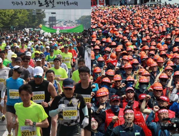 노동절인 1일 오전 서울 여의도 문화마당에서 열린 한국노총 2019 노동절 마라톤대회에서 참가자들이 힘차게 출발하고 있다(왼쪽). 같은 날 오후 서울시청 앞 광장에서 민주노총 주최로 열린 2019 세계노동절 대회에서 참가자들이 구호를 외치고 있다. 이날 이들은 국제노동기구(ILO) 핵심협약의 조속한 비준, 노동법 개악 저지, 재벌 구조 해체 등을 촉구했다.