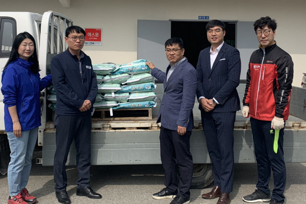 세종시 전의면에 위치한 친환경 투수 블록 생산업체인 (주)삼일리드텍이 1일 지역내 어려운 이웃 및 경로당에 전달해 달라며 사랑의 백미 10kg 50포를 전의면에 기탁했다. 사진은 업체 대표 및 관계자들이 기념촬영을 하는 모습. (사진제공=세종시청)