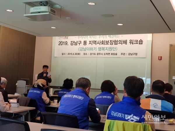 지난 30일 강남구 동 지역사회보장협의체 ‘강남 더·하·기 행복지원단’ 워크숍에서 민간위원장 22명이 강의를 들은 후 함께 기념촬영을 하고 있다. 강남구 동 지역사회보장협의체는 민관이 함께 구성된 협의체로 복지사각지대를 집중 발굴하고, ▲양성평등 체험부스 운영 ▲치매예방캠페인 ▲사례관리분과 우수사례발표회 개최 ▲아동·청소년 권리향상 캠페인 등 지역자원을 활용, 지역사회발전을 위해 다양한 사업을 추진하고 있다. 사진은 교육 진행모습. (사진제공=강남구청)