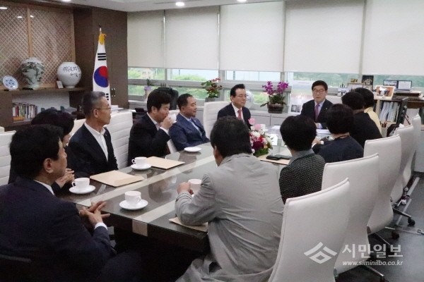 최근 서울 강남구의회 의원들이 경기도 광주시청에서 열린 ‘강남구-광주시 자매결연 협약식’에 참석해 차담회를 열고 양 도시가 다양한 분야에서의 교류를 통해 상호발전을 도모할 것을 약속했다. 사진은 구 의원들과 정순균 강남구청장, 신동헌 광주시장, 박현철 광주시의회 의장이 차담회를 진행하고 있는 모습. (사진제공=강남구의회)