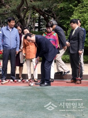 정순균 서울 강남 구청장이 최근 대치동 대치늘벗공원에서 열린 '제19회 강남구청장배 게이트볼 대회'에 참석했다. 사진은 대회 시작 전 시타를 하고 있는 정 구청장의 모습. (사진제공=강남구청)