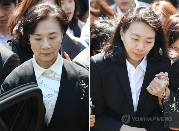 가사도우미를 불법 고용한 혐의로 기소된 한진그룹 고(故) 조양호 회장의 부인 이명희 씨(왼쪽)와 딸 조현아 전 대한항공 부사장이 2일 오전 서울 서초구 서울중앙지법에서 열린 첫 공판에 출석한 뒤 법정을 나서고 있다.