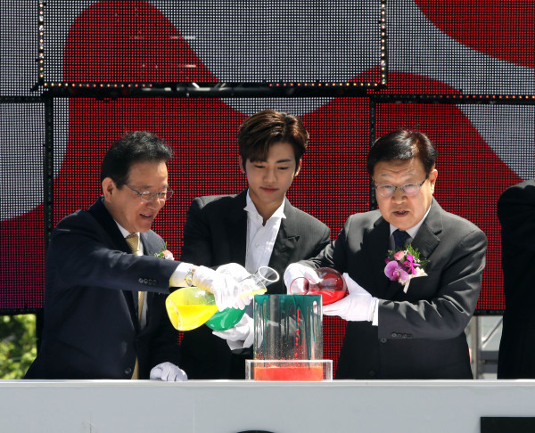 정순균 강남구청장(왼쪽 첫 번째)가 최근 코엑스 동문광장에서 열린 ‘C페스티벌 개막식’에 참석했다. 사진은 김영주 한국 무역협회장, 가수 NCT 드림 등 참석자들과 함께 개막 퍼포먼스를 하고 있는 정 구청장의 모습. (사진제공=강남구청)