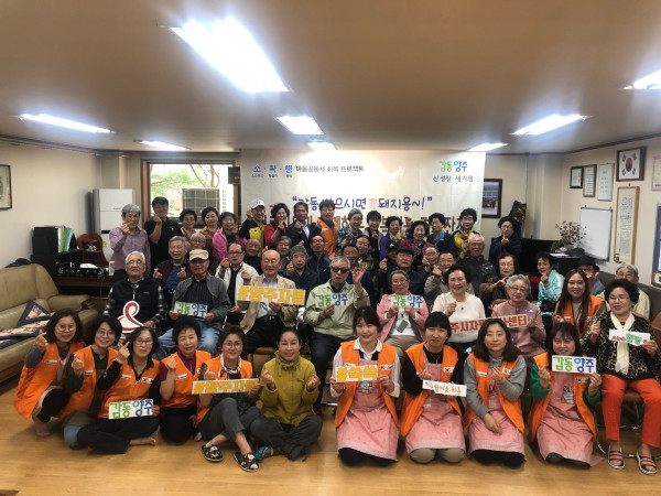 경기 양주시자원봉사센터는 어버이날을 앞둔 2일 삼숭 자이4단지 아파트 노인을 초대해 ‘어르신들과 함께하는 행복나눔 경로잔치’를 개최했다. 사진은 행사 참여자들이 기념촬영을 하는 모습. (사진제공=양주시청)