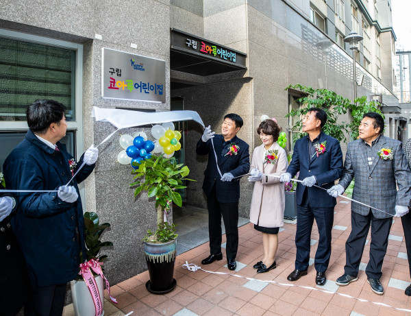 | ▲ 구립 코아루 어린이집 개원식에서 박형우 구청장(오른쪽에서 네번째)과 관계자들이 현판을 제막하고 있다. (사진제공=계양구청) | ||