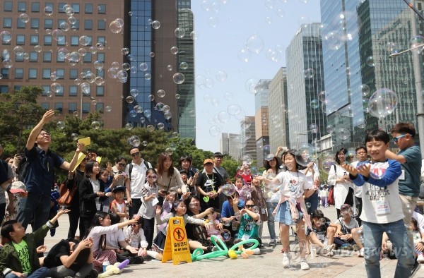 어린이날인 5일 서울 보신각에서 열린 '어린이날 희망타종행사'에 앞서 어린이들이 버블쇼를 보며 즐거워하고 있다.
