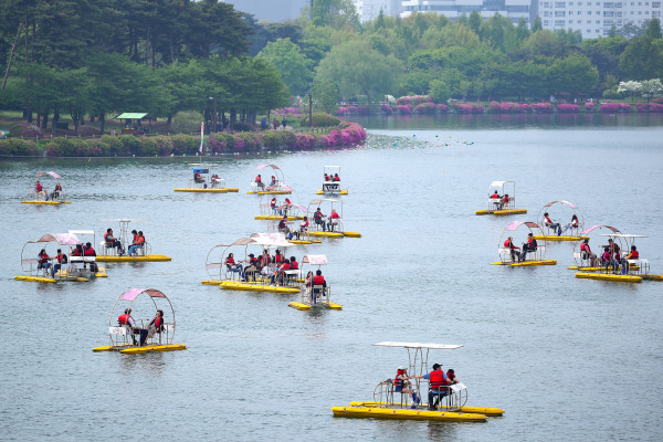 5일, 완연한 봄 날씨 속에 ‘2019고양국제꽃박람회’를 찾은 관람객들이 시원한 호수 위에서 ‘꽃 자전거 체험’을 하며 평화로운 시간을 보내고 있다.
