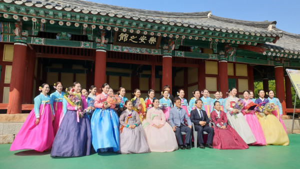 최근 전남 순천시 낙안읍성에서 가야금병창 오태석 명인을 기념하는 ‘제12회 낙안읍성 전국 가야금병창 경연대회’가 열렸다. 이날 총 112팀 187명이 참가해 열띤 경연이 펼쳐졌다. 사진은 경연대회 참가자들이 기념촬영을 하는 모습. (사진제공=순천시청)