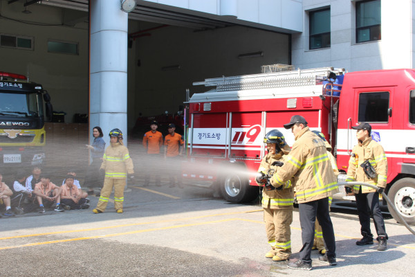경기 이천소방서가 최근 지역내 증포중학교 학생 15명을 대상으로 소방공무원 진로탐색과 직업 체험의 기회를 제공하는 ‘미래소방관 체험교실’을 운영했다. 사진은 방화복을 입고 직접 방수 체험을 하는 학생들의 모습. (사진제공=이천소방서)