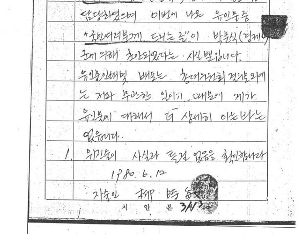 유 이사장은 “(진술서 중) 내가 1980년 3월 심재철 의원을 처음 만난 대목부터 완전히 창작이었다”며 “합수부 수사관들이 ‘그럴 수도 있겠다’ 생각하도록 성의있게 진술하는 것이 중요했다”고 설명했다.