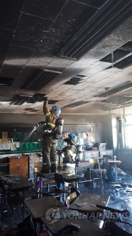 7일 오전 경기도 성남시 분당구의 한 초등학교에서 불이 나 학생과 교직원 등 500여명이 대피했다. 인명피해는 없었다. 사진은 불에 탄 교실.