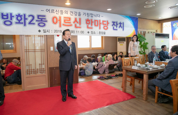 서울 강서구는 7일 어버이날을 맞아 노인들을 대상으로 경로행사를 개최했다. 경로행사는 오는 23일까지 전동에서 열릴 예정이다. 사진은 노현송 구청장이 방화2동에서 열린 행사에 참석해 노인들에게 감사의 뜻을 전하는 모습. (사진제공=강서구청)