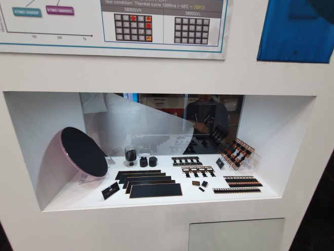 KCC는 무기소재 라인업도 다양하게 준비해 관람객의 눈길을 끌었다. 대표적인 무기소재 제품으로는 반도체를 먼지, 충격 등으로부터 보호해주는 봉지재인 EMC(Epoxy Molding Compound: 메모리 반도체 보호소재)와 전력용 반도체에 사용되는 DCB(Direct Copper Bonded)기판 등이다.