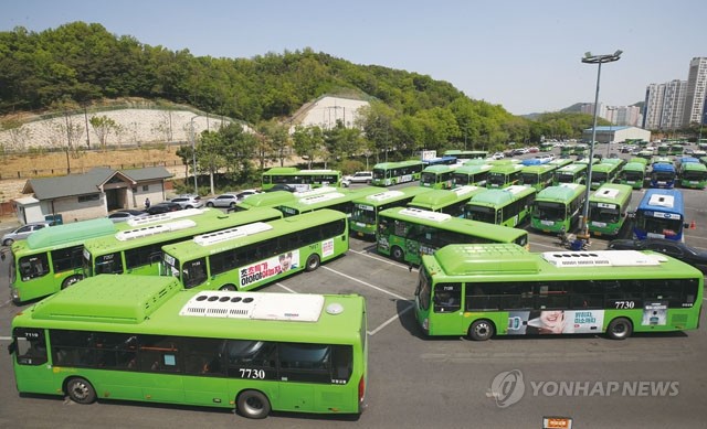 9일 서울시버스노조가 파업 여부를 결정하는 투표를 실시했다. 이날 투표 결과에 따라 오는 15일 서울 시내버스 전체 노선 운행 중단여부가 결정 된다. 사진은 이날 서울 은평공영차고지에 주차된 버스.