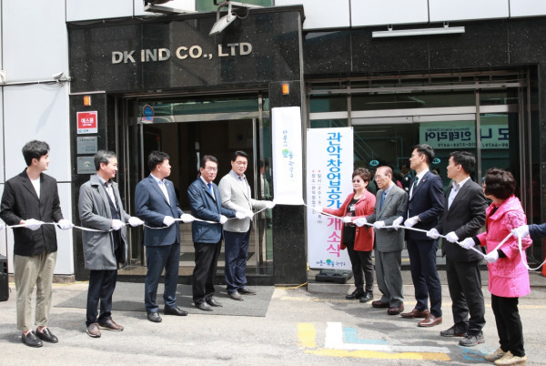 관악구가 최근 낙성벤처밸리의 첫 번째 창업지원시설인 ‘관악 창업공간’ 개소식을 개최했다. 이날 행사에는 박준희 구청장을 비롯해 11개의 입주기업대표와 주민 70여명 등이 참석했다. 사진은 박 구청장과 관계자들의 현판식 진행 모습. (사진제공=관악구청)
