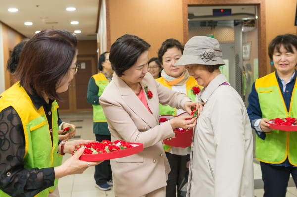양천구는 최근 어버이날을 맞이해 구청 실버식당에서 ‘孝-Dream 카네이션 전달식’을 개최했다. 이날 자원봉사자들은 카네이션을 제작해 200여명의 노인에게 전달했다. 사진은 김수영 구청장이 노인에게 카네이션을 달아주는 모습. (사진제공=양천구청)