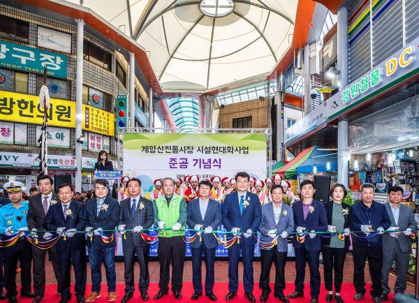 인천 계양구가 최근 계양산전통시장 만남의 광장에서 지역주민 200여명이 참석한 가운데 지역의 오랜 숙원사업이었던 '계양산전통시장 시설현대화사업' 준공 기념식을 개최했다. 사진은 이날 행사에 참석한 박형우 구청장 및 관계자들의 테이프 커팅식 모습. (사진제공=계양구청)