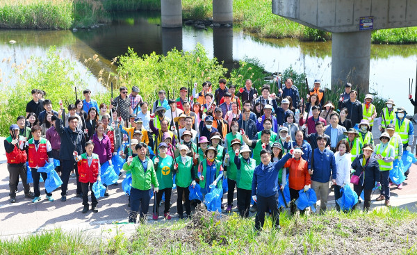 경기 광주시가 10일 지역주민, 민간단체 등 1500여명이 참여한 가운데 ‘5월 광주시 청소의 날’을 맞아 주택가 이면도로, 하천변 등에서 대청소를 실시했다. 사진은 이날 행사에 참여한 신동헌 시장과 관계자들의 기념촬영 모습. (사진제공=광주시청)