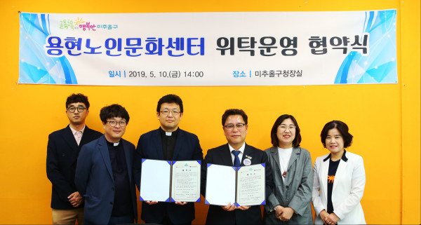 인천 미추홀구가 10일 인천가톨릭사회복지회와 '용현노인문화센터 위탁운영 협약식'을 열었다. 이날 협약식에 따라 가톨릭사회복지회는 오는 6월부터 5년간 노인문화센터를 운영한다. 사진은 김정식 구청장(오른쪽에서 세번째)과 관계자들의 기념촬영 모습. (사진제공=미추홀구청)
