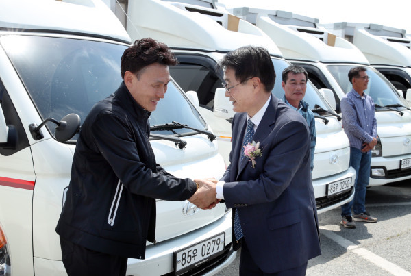 전남 강진군은 10일 국민체육센터 일대에서 ‘2019년 원예생산기반 활력화 공모사업’ 선정으로 지원받게 된 저온수송차량 13대의 시승식을 개최했다. 사진은 이날 행사에 참여한 이승옥 군수가 시승할 차량의 운전기사들을 격려하는 모습. (사진제공=강진군청)