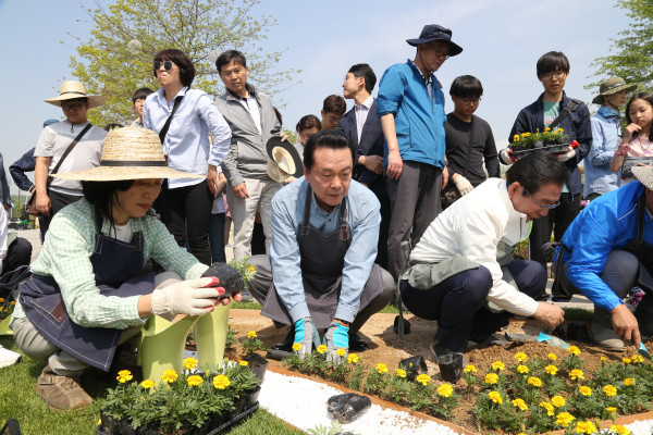 서울 강서구는 최근 마곡동에서 ‘서울식물원 개원 축하행사’를 개최했다. 이날 행사에 참석한 노현송 구청장은 식물원 개원을 축하하며 자원봉사자들과 봄꽃 5만송이를 심었다. 사진은 노 구청장(가운데)과 자원봉사자들이 봄꽃을 심는 모습. (사진제공=강서구청)