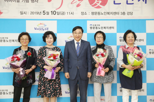 서울 도봉구는 최근 제47회 어버이날을 맞이해 쌍문동 노인복지센터 강당에서 열린 ‘어버이날 기념행사’에서 노인복지 발전에 기여한 개인 및 단체에 유공자 표창을 했다. 사진은 이동진 구청장(가운데)과 표창 수여자들이 기념촬영을 하는 모습. (사진제공=도봉구청)