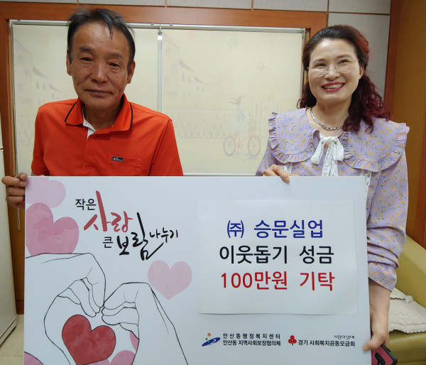 경기 안산시 안산동 행정복지센터는 13일 (주)승문실업으로부터 어려운 이웃을 위한 성금 100만원을 기탁받았다. 이날 기탁된 성금은 안산동 지역사회보장협의체를 통해 지역내 어려운 이웃을 위해 사용될 예정이다. 사진은 기념촬영을 하는 모습. (사진제공=안산시청)